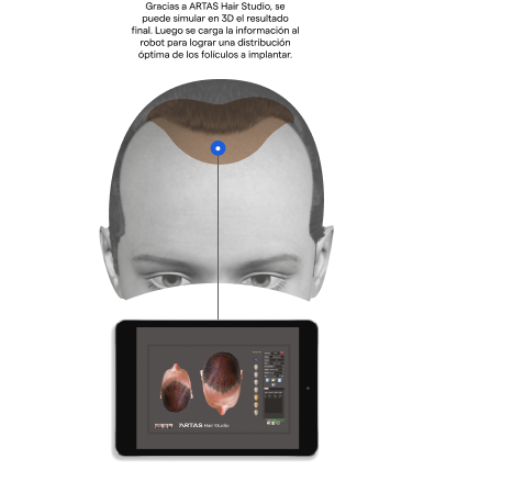 ARTAS® cuenta con un software llamado HAIR STUDIO que permite planificar el diseño del trasplante antes de la cirugía y que el paciente se vea en una imagen simulada con el diseño en el que se va a trabajar. Este diseño -como en todo microtrasplante- se consensúa entre el cirujano y el paciente, y es íntegramente personalizado, de acuerdo a la historia clínica, necesidades y expectativas de cada paciente.